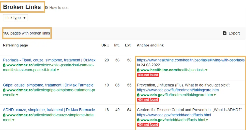 Nu avem multe – 26 de backlinks către pagini care nu mai există pe drmax.ro (în baza la Ahrefs) – din care doar 6 au un DA de peste 20.