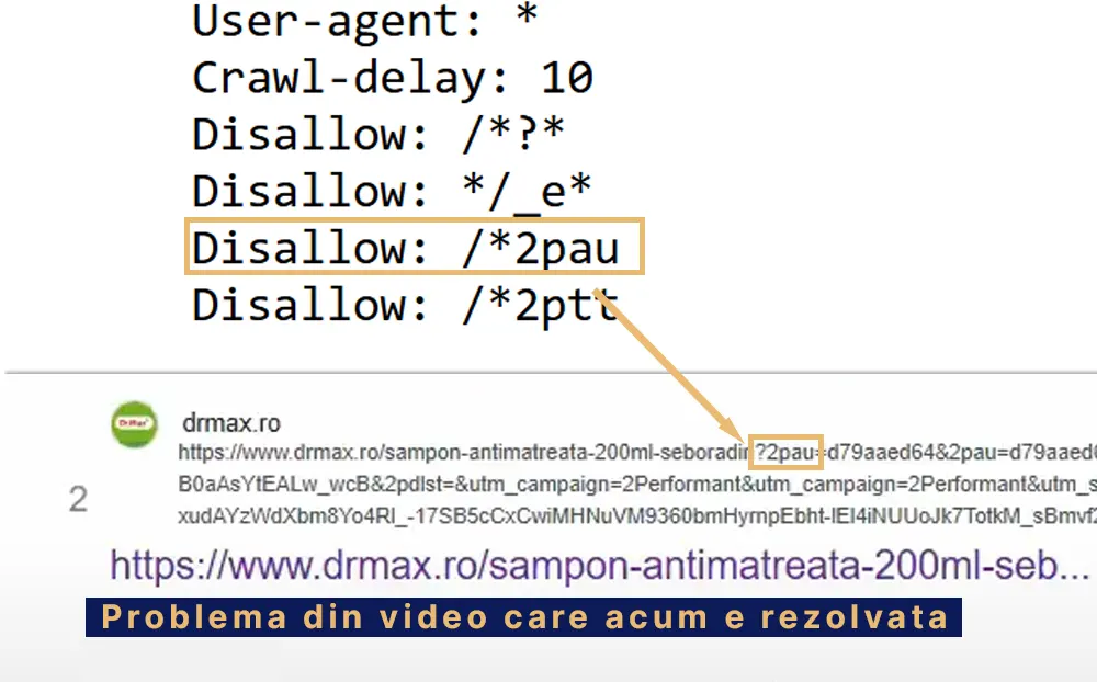 Bănuiesc că link-ul inițial din video, problema a fost rezolvată deoarece avem în robots.txt directiva ‘Disallow: /*2pau‘ – acel link duplicat din video având în URL termenul 2pau.