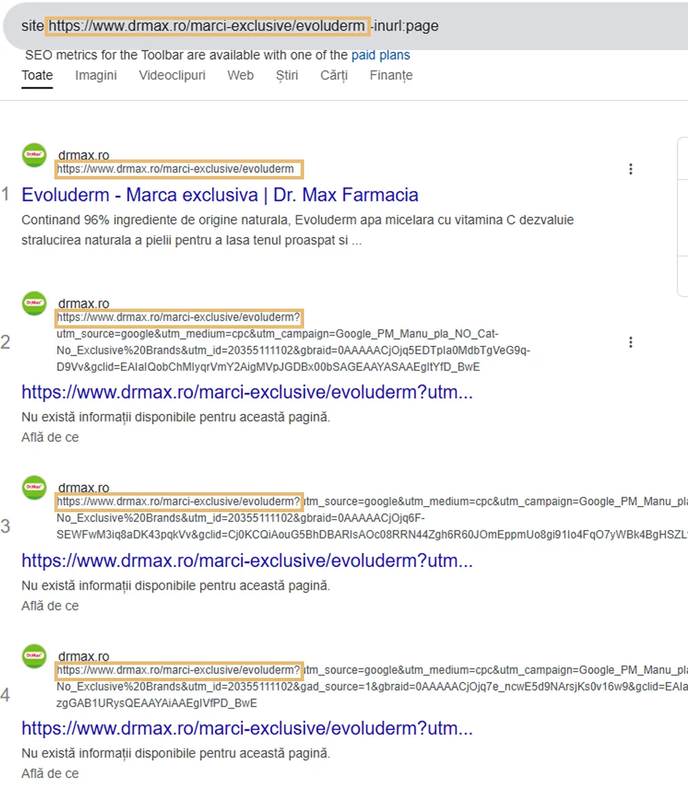 Mai mult, încercând să găsesc aceeași problemă pe o altă pagină asemănătoare am găsit o altă problemă similară – URL-uri cu parametri de tracking sunt indexate în Google.