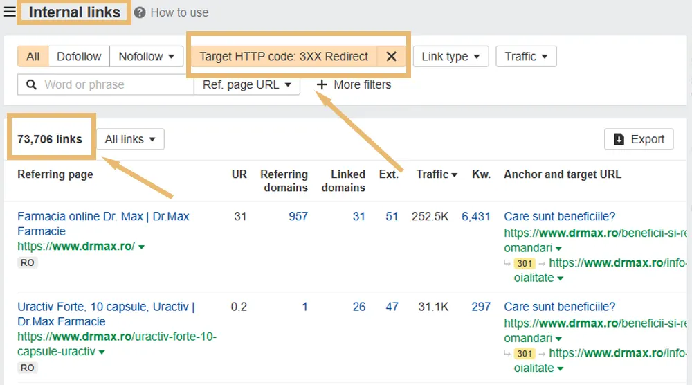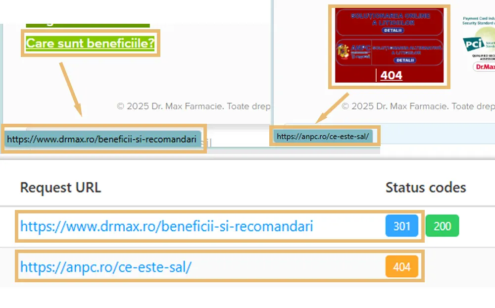 În baza la ce arată Ahrefs sunt peste 70.000 de pagini cu internal links care au redirect 301 pe site-ul drmax.ro – majoritatea fiind acest link din footer.