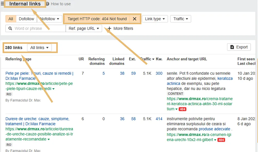 7. Backlinks către pagini 404 pe drmax.ro
