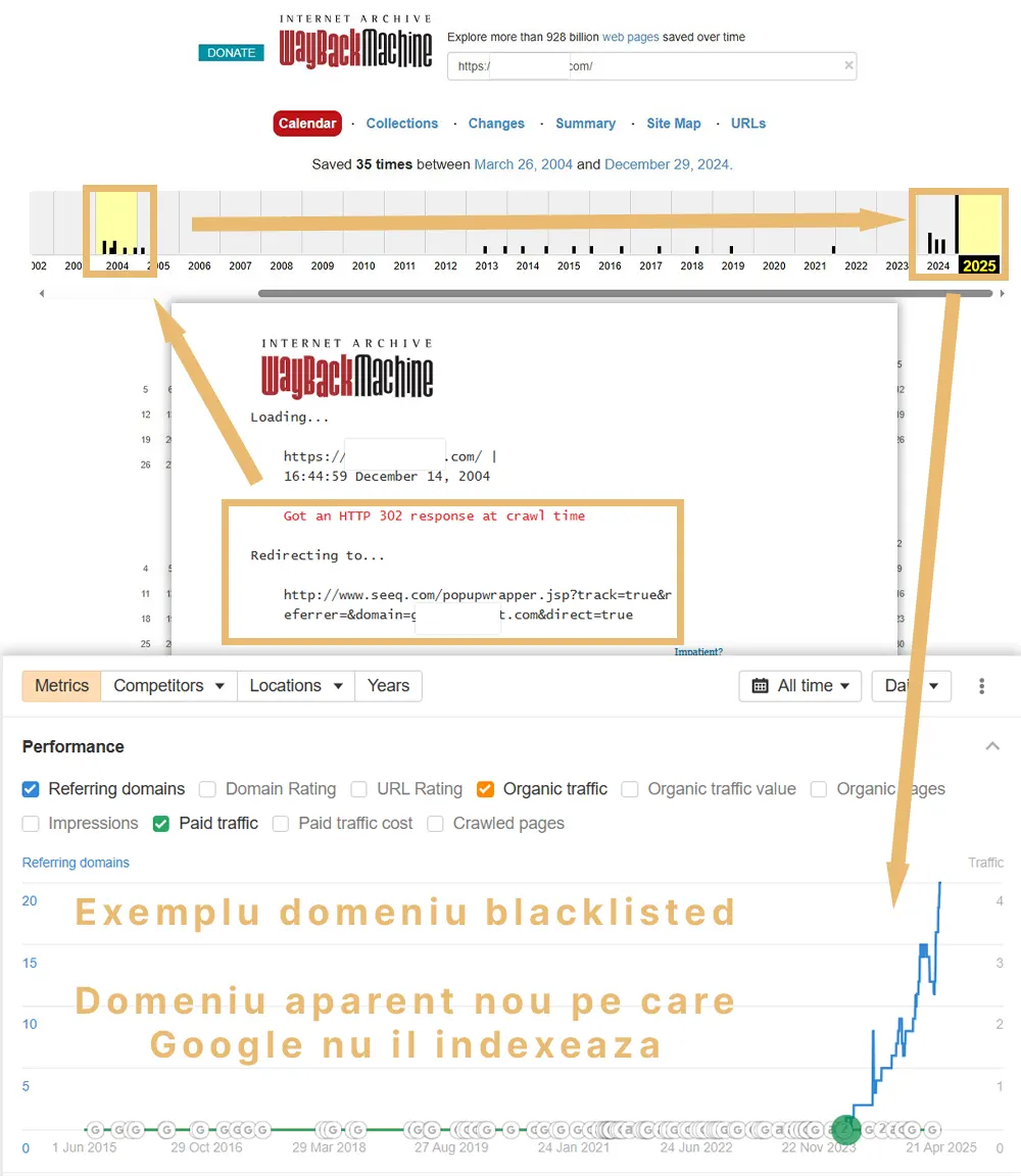 În imaginea de mai jos poți să îți dai seama cum să verifici – în anul 2004 acest domeniu fusese deja folosit ca redirect către alt domeniu. Deși am publicat peste 30 de pagini și câteva backlinks bune, Google refuză să îl indexeze și are trafic zero.